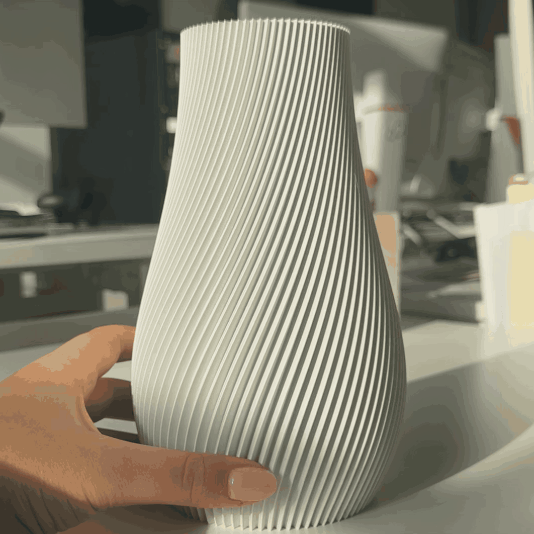 Die Clipvase aus 3D-gedrucktem, biologisch abbaubarem PLA überzeugt durch ihre sanft gewundene Form, die Ruhe und Eleganz ausstrahlt. Ob im Büro oder Zuhause – sie setzt stilvolle Akzente und vereint modernes Design mit Umweltbewusstsein.